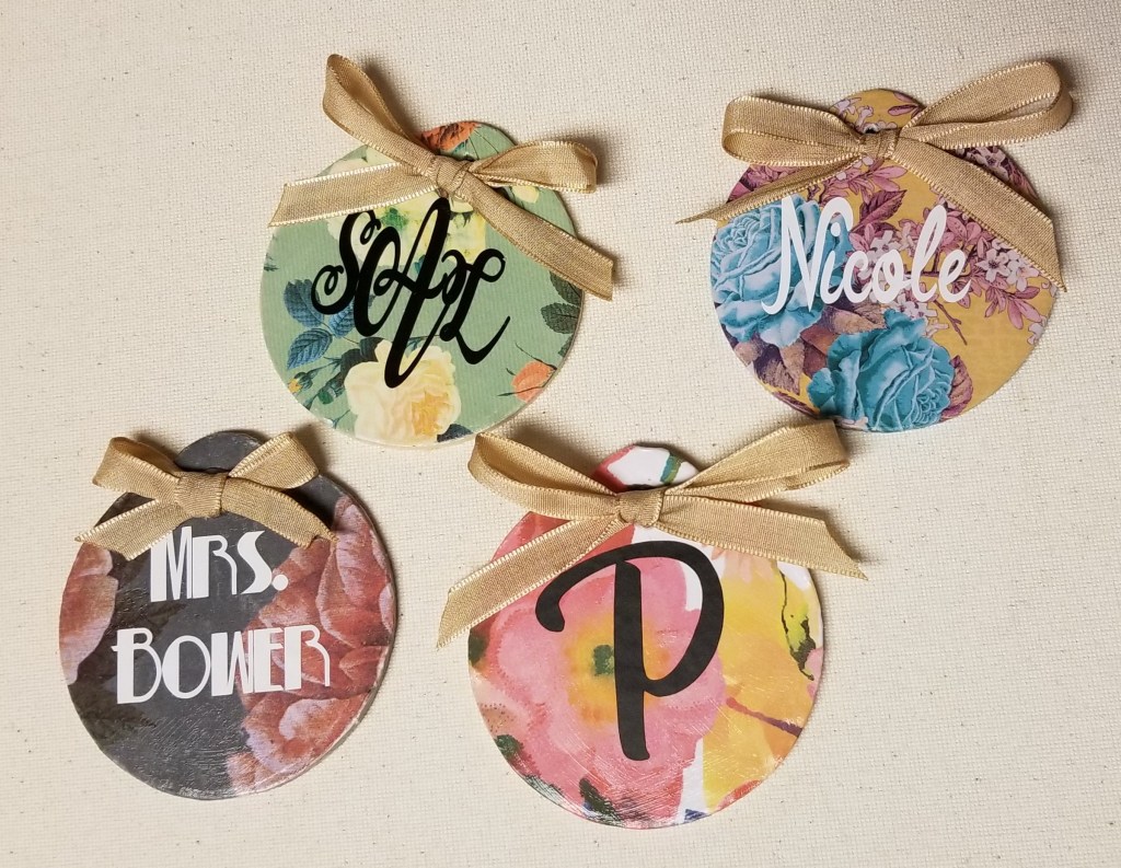 Ornaments with pretty scrapbook paper backgrounds are great to personalize with a name or monogram. These make a nice gift that can fit in a greeting card, or be used as a gift tag!