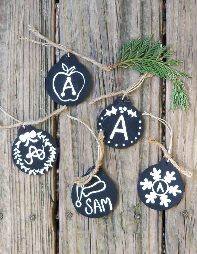 The newest ornament design I’m doing this year is a chalkboard art style ornament. It’s got a simple black chalkboard background with a name or monogram and a simple decoration. These are cute and classic looking. I think they will make GREAT teacher gifts!