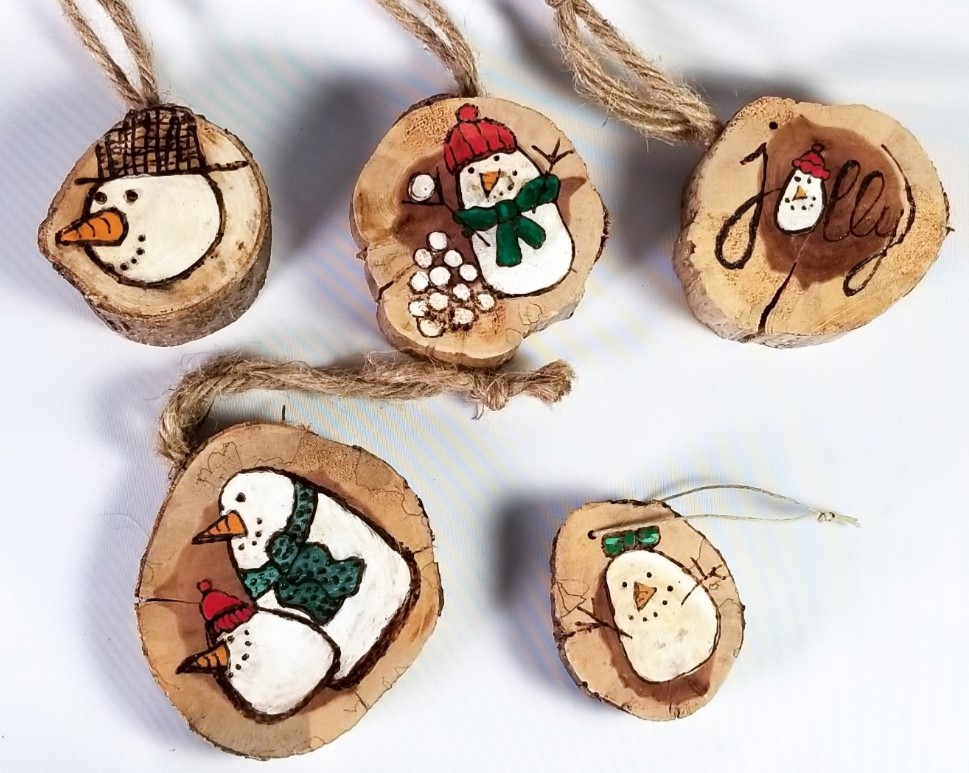 I also LOVE snowmen, so I’ve focused the art on my wood ornaments on portraying snowmen in a variety of scenes or multi-piece snowmen. I wood burn a design, then paint it with acrylic paint, and finally seal the ornaments. They have such a cute rustic look that I love!
